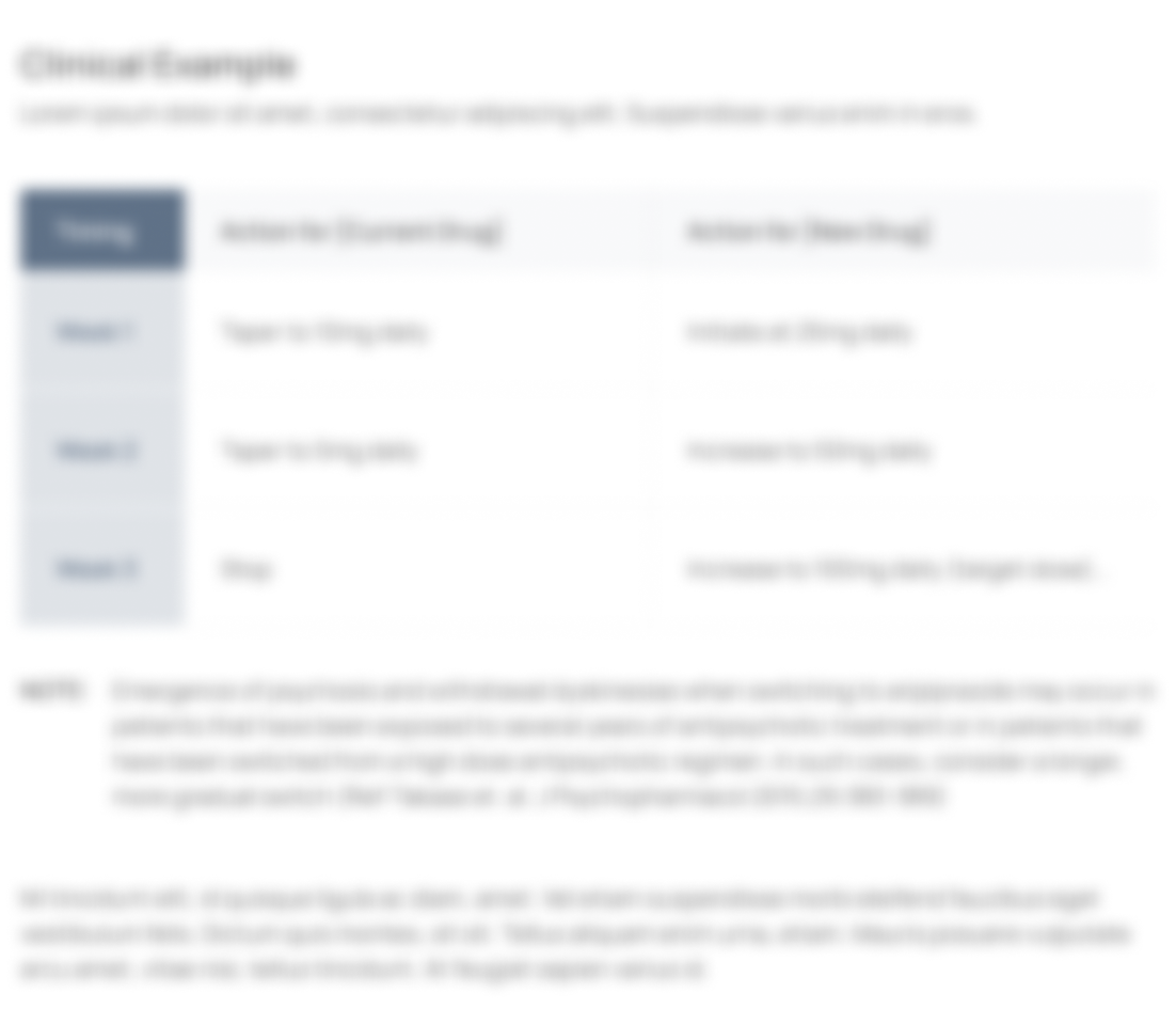 Important: The optimal switching protocol can vary depending on the disorder being treated. Register to access the full plan tailored to specific conditions like Schizophrenia or Bipolar Disorder.
